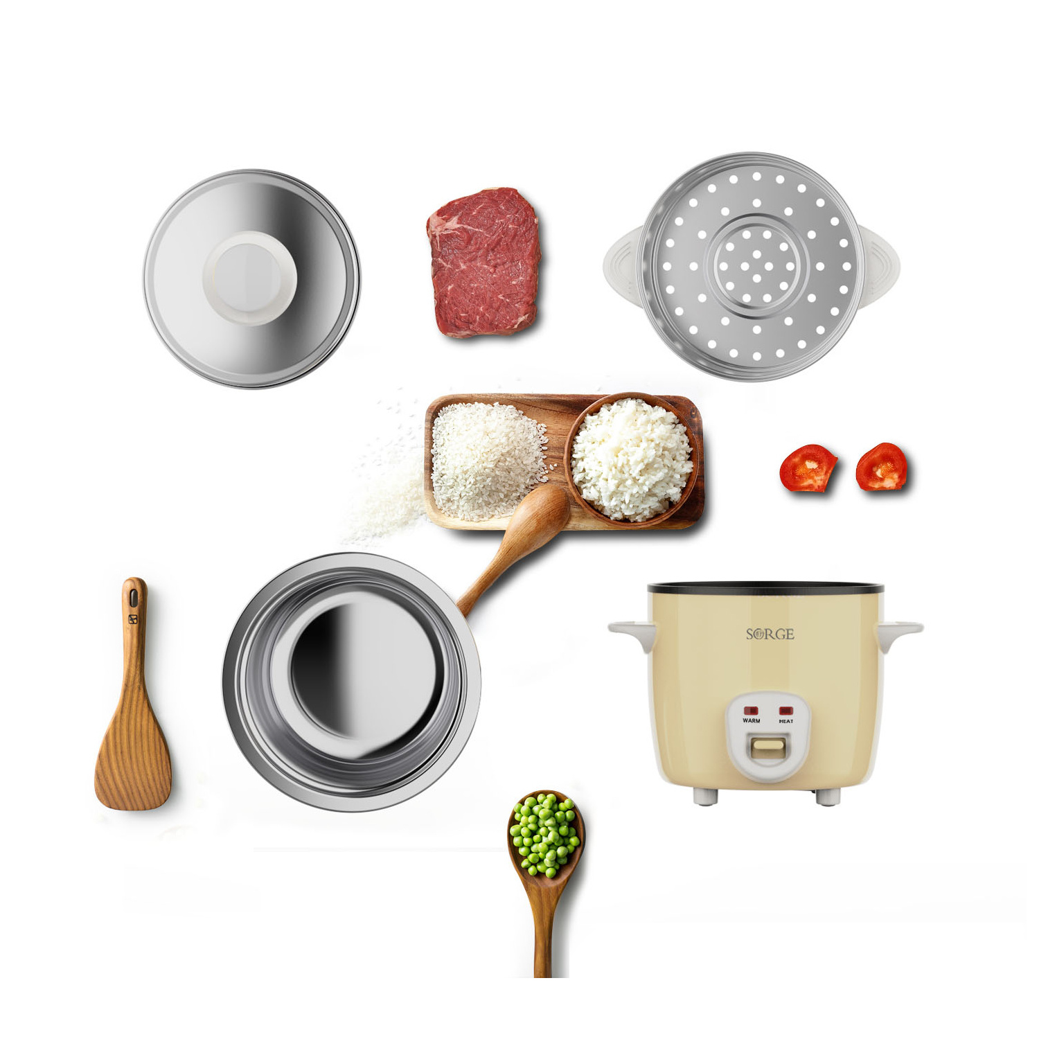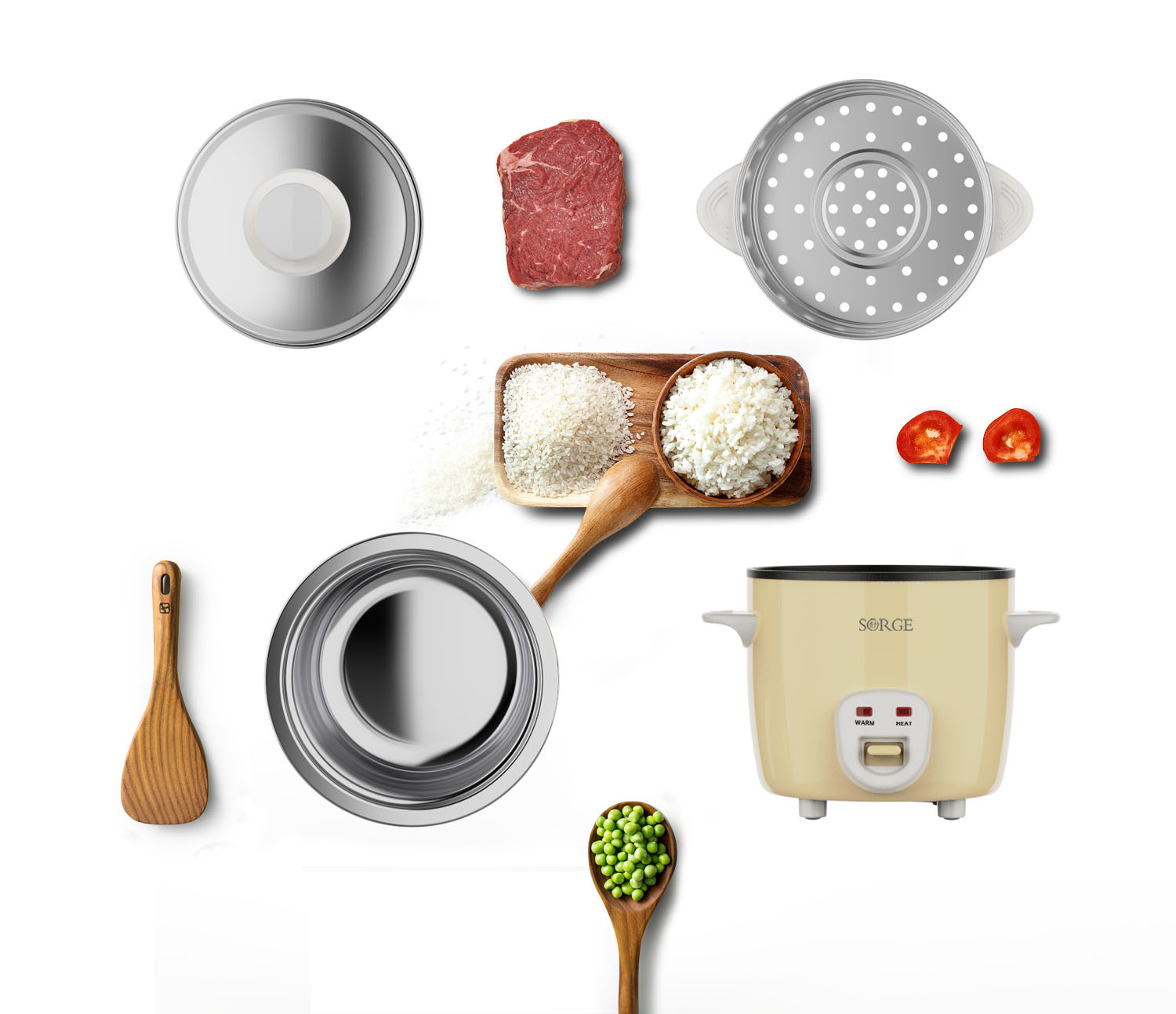 配件:这款炊具包括一个耐用的SUS304内锅、一个量杯、一个蒸篮、手动、电源线和一个饭勺。 -
